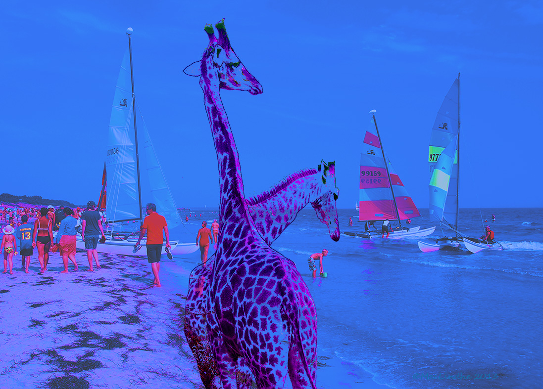 Två sydafrikanska giraffer besöker stranden i Falsterbo under sandslottstävlingen. Och det var bara killen i vattnet som lade märke till dem.
