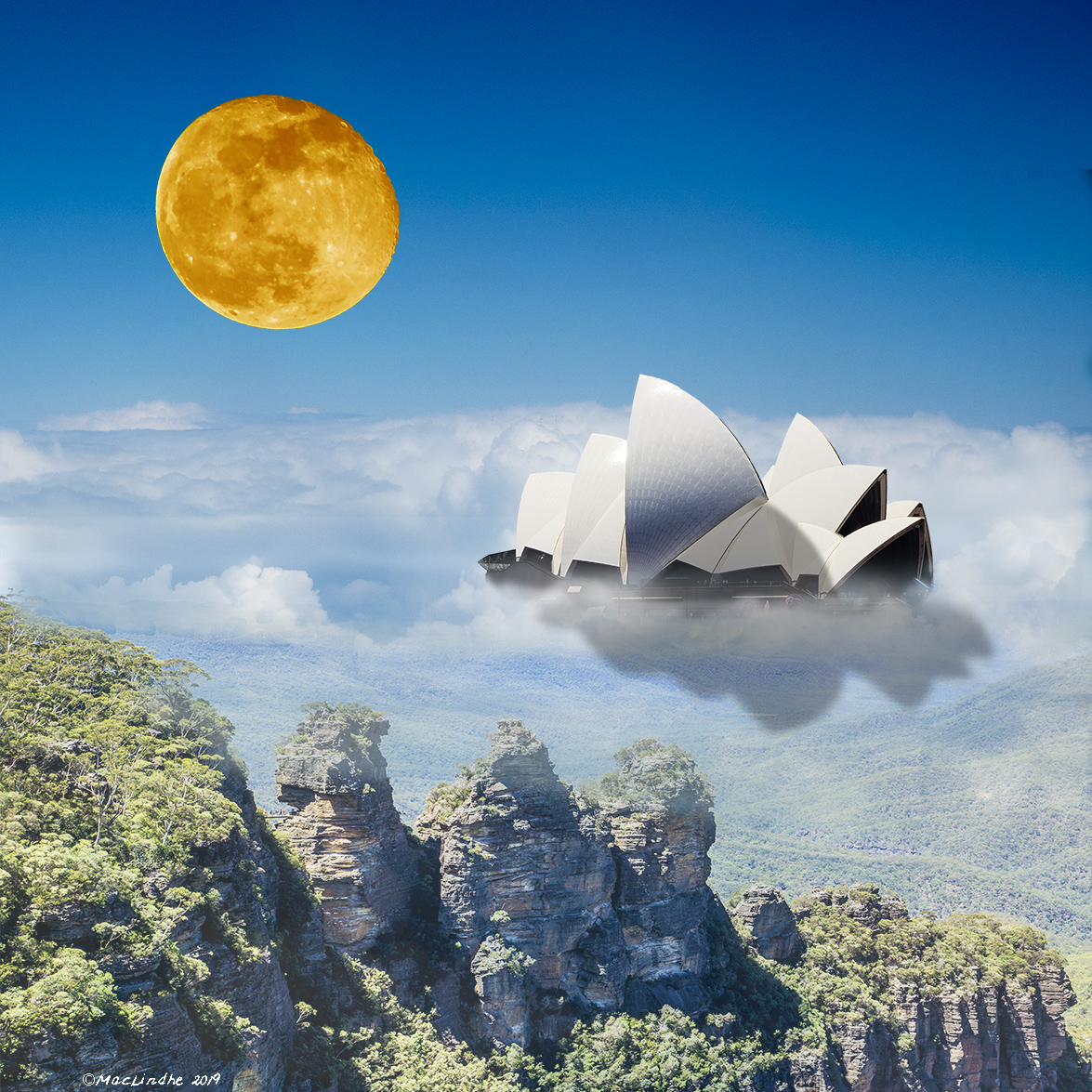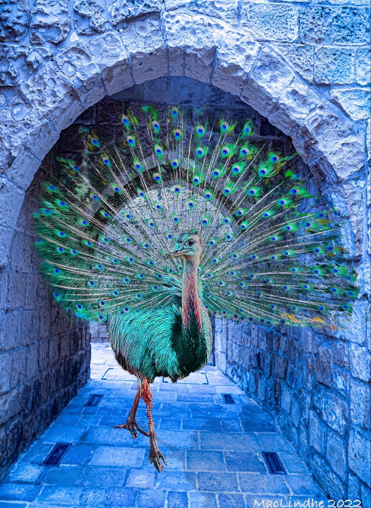 Mot bakgrunden av en mörk stad (Melbourne) finns en murad port från Kärleksstigen i Falsterbo, med blommor från en äng i Kämpinge, som leder in i Trollskogen på Vellingeblomman där två munkparakiter från Torre de la Horadada i Spanien sitter.
