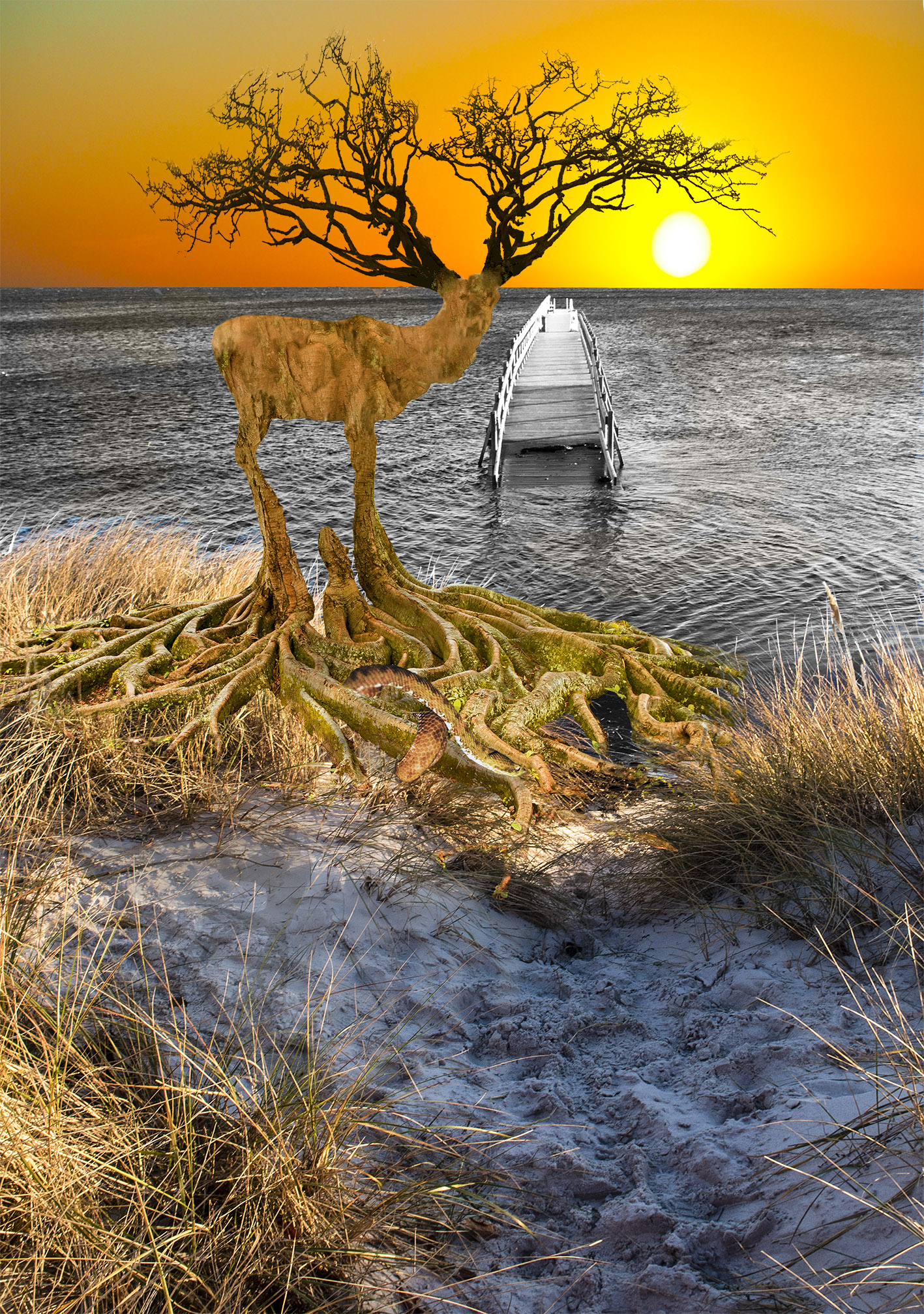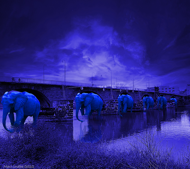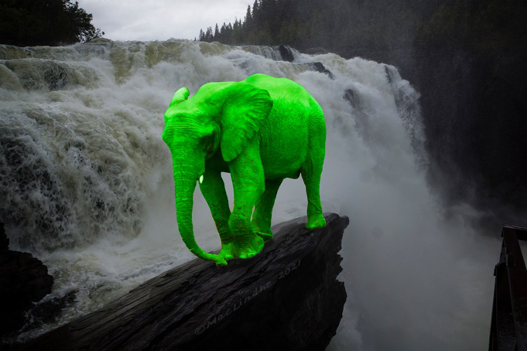 Sjön, bryggan och ekan har jag fotograferat utanför Lönsboda, och elefanten är en lek med AI.