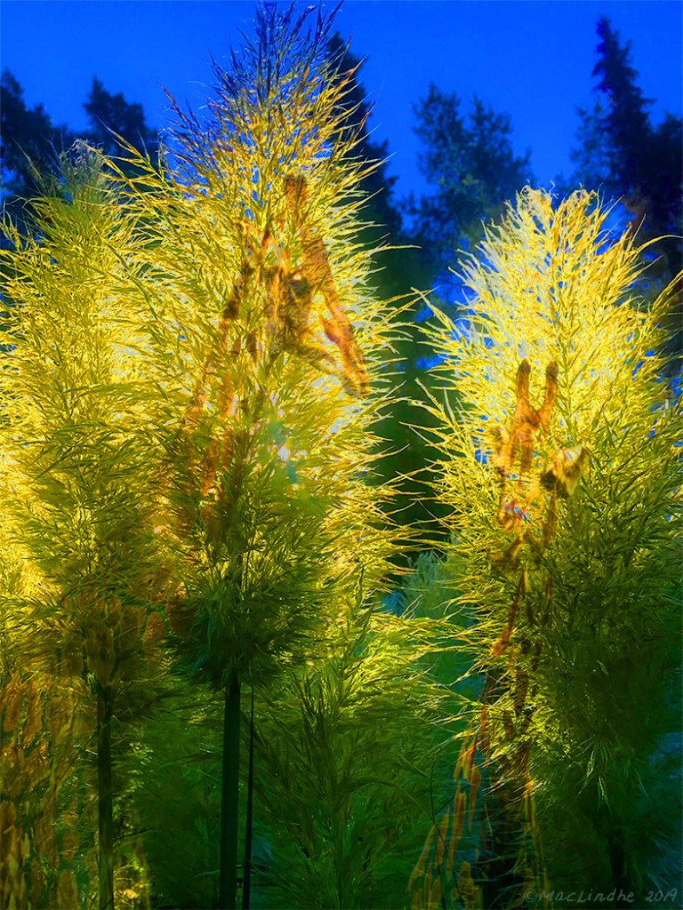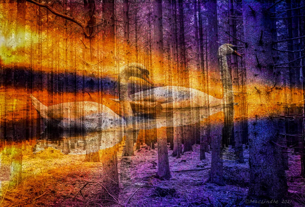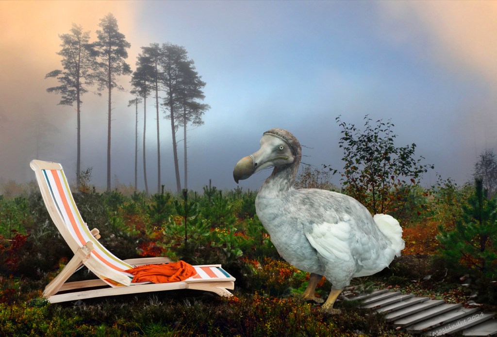 Skogsbad är en sorts terapi som har sitt ursprung i Japan på 1980-talet, för att motverka stress. Dronten fotograferade jag på Oxfords naturhistriska museum, och landskapet är i de småländska skogarna. Solsängen är faktiskt en produkt av AI.