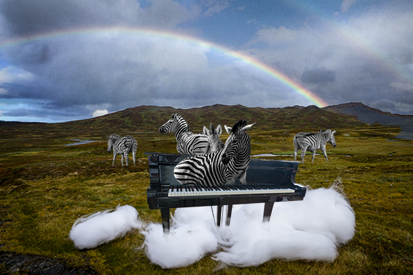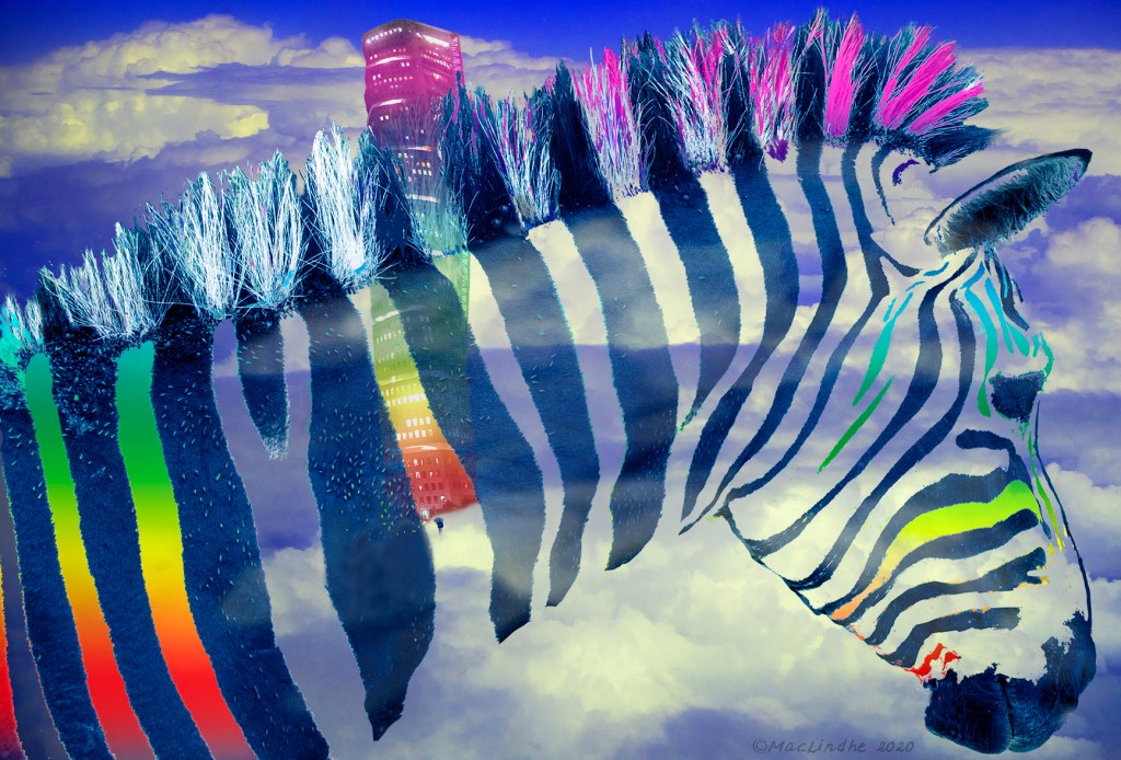 Zebror föds ur musik! De här (som jag fotograferat i Sydafrika) växer fram ur flygeln, som seglade på ett moln från Skanörs kyrka ända upp till Stekenjokk. Och regnbågen fanns över Storsjön i Jämtland.