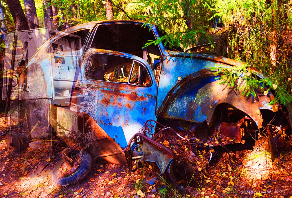 Björnen vaktade bagagebandet på Kirkenes flygplats i Norge, bilen stod parkerad på en gata i Kämpinge (men har blivit omlackerad av mig i Photoshop) och så har den landat i Körsbärsdalen utanför Veberöd i Skåne.
