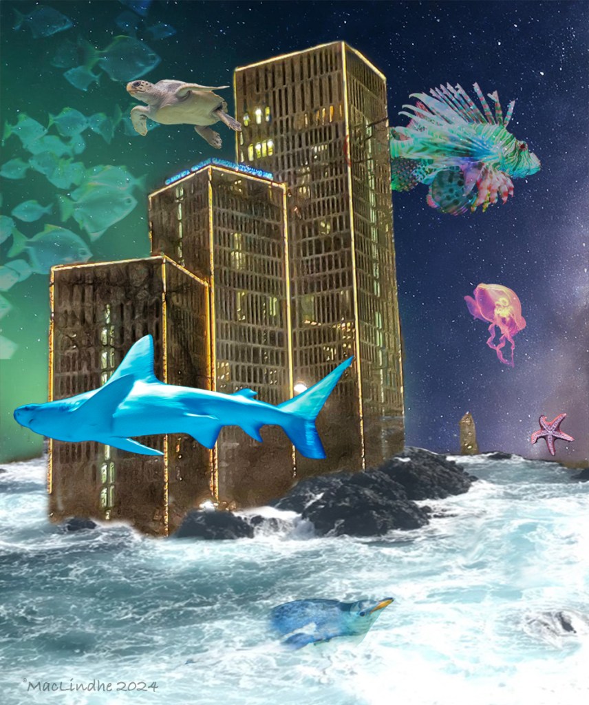 Lite dystopiskt kanske? Byggnaden är Malmö Live, havet och stenarna är fotograferade på Teneriffa, fiskarna, sköldpaddan och pingvinen på Melbourne Aquvarium, Loro Parque Teneriffa och Blå Planeten i Köpenhamn.