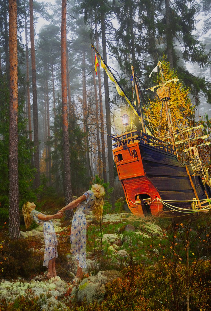 Skeppet, en replika av en av Columbus skepp, ligger i Sevillas hamn, skogen är i Skåne och två små modeller dansar.
