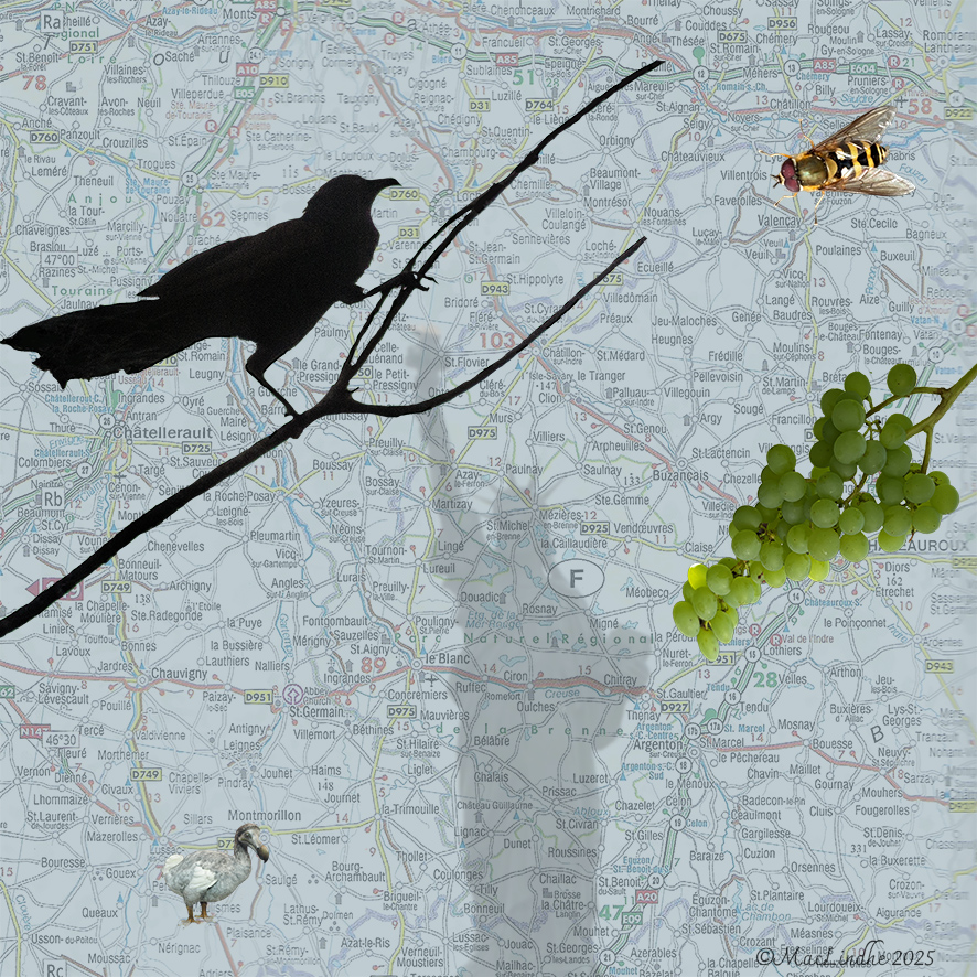 Mer som flugit förbi och lämnat spår i mitt medvetande. Bakgrunden är en karta över Frankrike, dit jag snart åker med mina kameror (och lite vin!) Men druvorna är fotograferade här hemma, hängande på vinrankan. Frihetsgudinnan står vid infarten till Colmar där hennes skapare, Auguste Bartholdi, bodde, fotot från 2021. Att hon bara är en skugga är för att demokratin är hotad där den stora statyn står.
