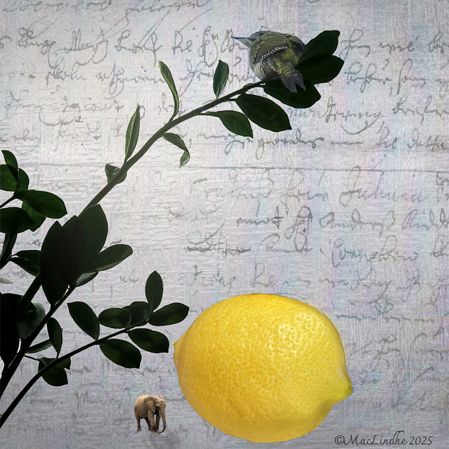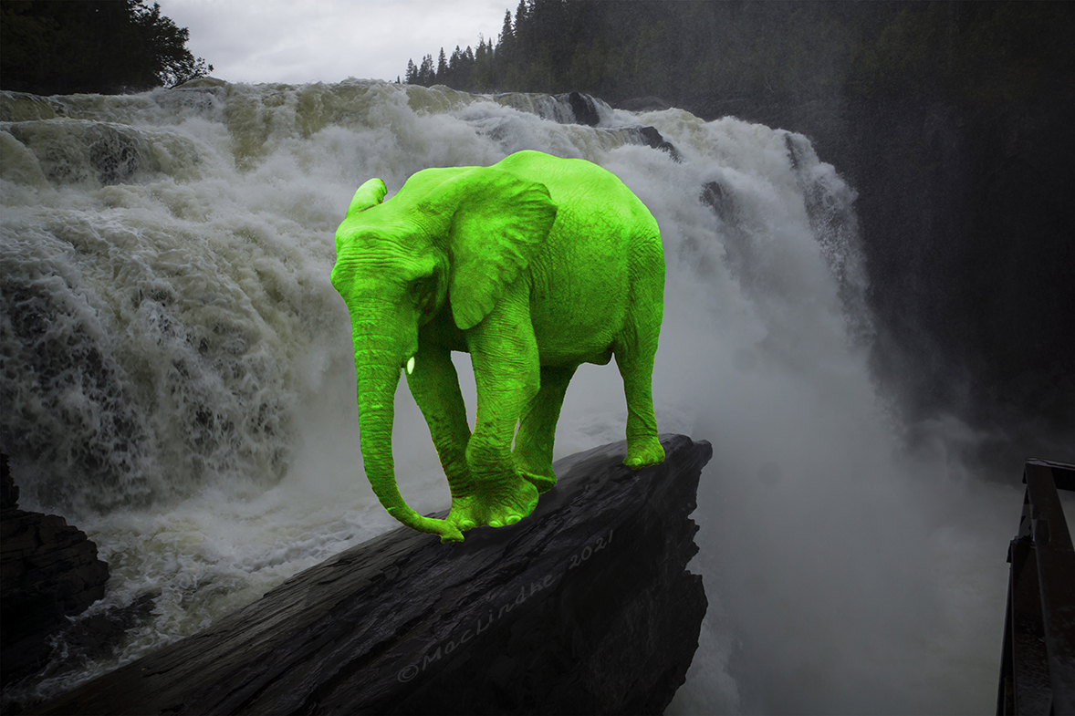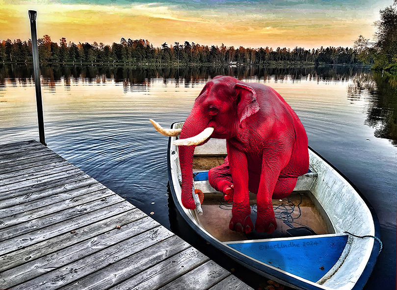 Sjön, bryggan och ekan har jag fotograferat utanför Lönsboda, och elefanten är en lek med AI.