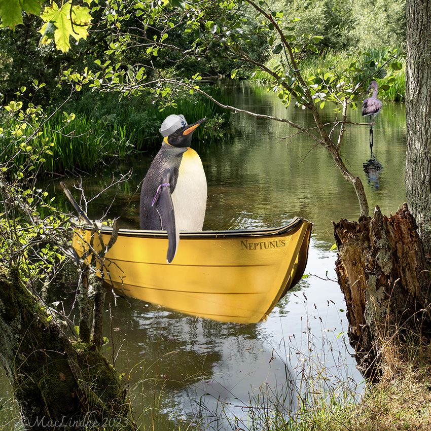 En självutnämnd kapten med stora planer har hamnat med sin eka i Verkeån, till flamingons förvåning. Pingvinen är fotograferad på Loro Parque på Teneriffa, och flamingon i saltsjöarna i San Pedro., Spanien.