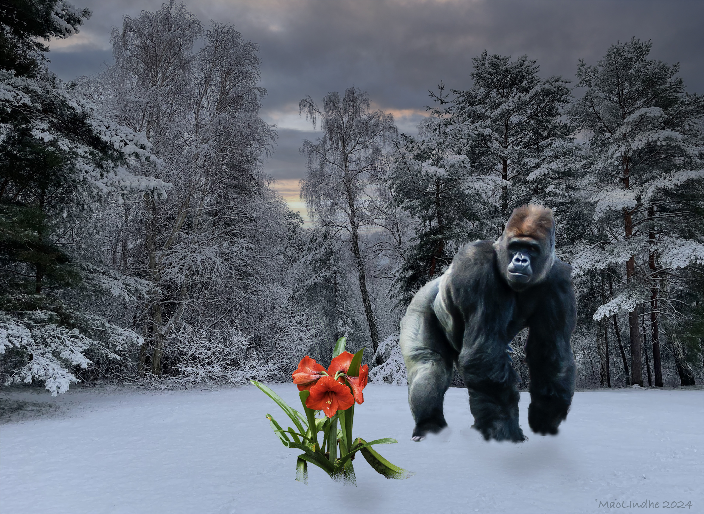Två som tröttnat på snön i Höllviken; en gorilla från Loro Parque på Teneriffa och en amaryllis från mitt kök.