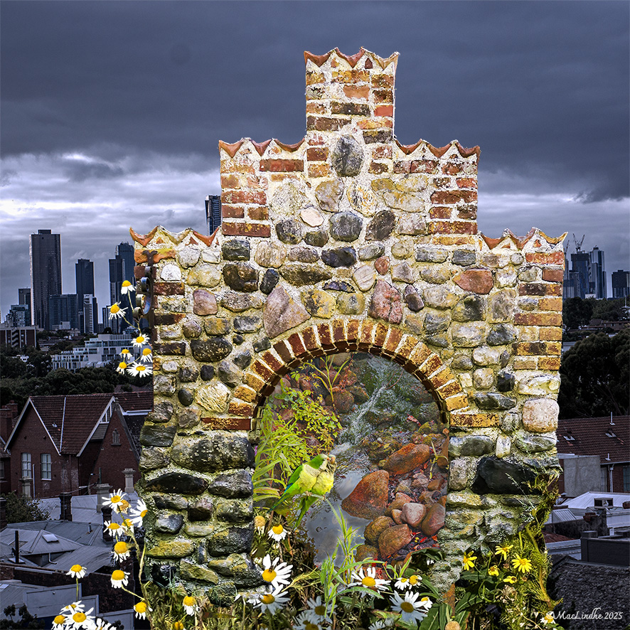 Mot bakgrunden av en mörk stad (Melbourne) finns en murad port från Kärleksstigen i Falsterbo, med blommor från en äng i Kämpinge, som leder in i Trollskogen på Vellingeblomman där två munkparakiter från Torre de la Horadada i Spanien sitter.